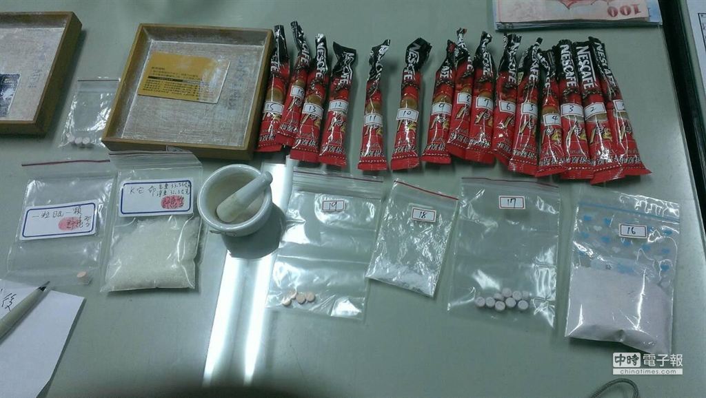 有毒品、偽造文書前科的盧男,供稱毒品是他帶來的,只供吸食,沒有對他人販售,現場則起出15包K他命咖啡,超過100多公克,另有搖頭丸9顆、一粒眠4顆,當晚是準備要來開轟趴。