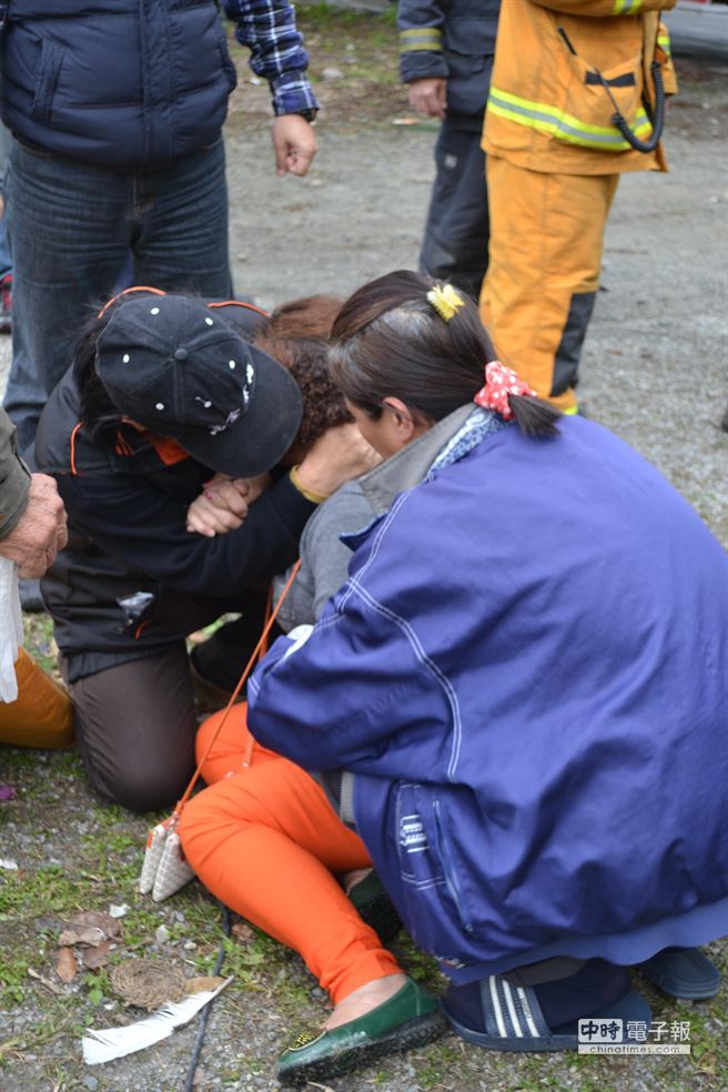 高的母親感到現場後,難過的痛哭失聲並癱軟在地上,大喊:「我的兒子啊!」(簡浩正攝) 花蓮縣新城鄉景美村一戶民宅,今日下午發生一起火警,消防局據報後趕往撲救,因大火猛烈,經50分鐘左右火勢才完全撲滅。